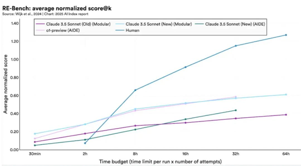 AI Agent展现初步潜力。2024年推出的RE-Bench为评估Agent复杂任务设立了严格基准:在短时任务(2小时)中,顶级AI系统表现超人类专家4倍;但在长时任务(32小时)中,人类反超AI达2倍优势。