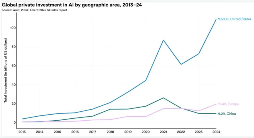 在生成式AI领域差距更为显著:美国投资额超出欧盟与英国总和255亿美元,较2023年的211亿美元差距进一步扩大。