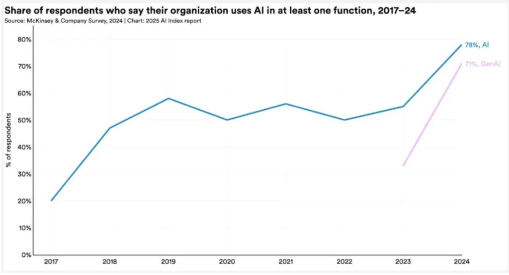 企业正在转向AI。2024年,报告使用AI的受访者比例从2023年的55%跃升至78%。更值得注意的是,将生成式AI应用于至少一项业务职能的企业比例实现翻倍增长,从33%激增至71%。