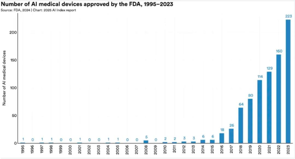 FDA批准的AI医疗设备数量呈现指数级增长。自1995年首个AI医疗设备获批后,2015年仅累计批准6个,而到2023年这一数字已飙升至223个,展现出医疗AI应用的加速普及态势。