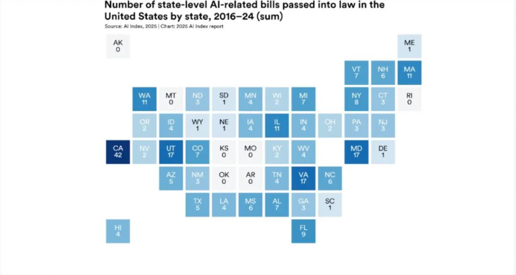 在联邦立法进展缓慢的背景下,美国各州正成为AI监管的主力军。2016年全美仅通过1项州级AI相关法案,到2023年增至49项。