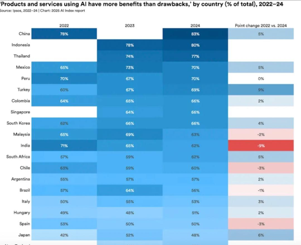 全球对AI的接受度呈现明显地域差异:在中国(83%)、印尼(80%)和泰国(77%),绝大多数民众认为AI产品利大于弊;而在加拿大(40%)、美国(39%)和荷兰(36%),持此乐观态度的民众比例不足半数。