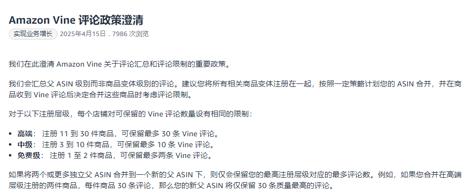 这是怎么回事呢?原来亚马逊在2025年4月15日发布了一则新闻:Amazon Vine 评论政策澄清。 具体如下: