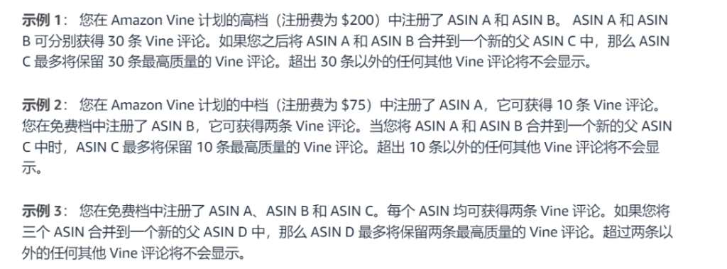 这意味着:即使亚马逊卖家在多个单独注册的 ASIN 中注册了更多商品VINE,在亚马逊卖家合并 ASIN 后,商品详情页面上只会显示亚马逊卖家档位对应的最多评论数量。 2