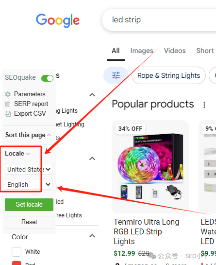如上截图,定位国家和语言,点击确认之后,一定要看看谷歌SERP最底部同步没有。由于每个人使用的上网梯子不同,有时候靠这个SEOquake定位国家也不一定能实现,所以一定要核对谷歌真的同步了之后才去看查询的排名,不然排名还是不是你要查的目标国家。这牵扯到很多关于插件本身和你的科学上网梯子的诸多细节问题了,SOP的细节决定了成败。
