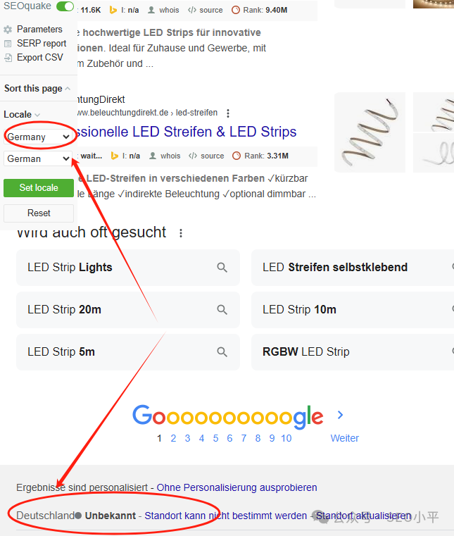 如下图我在SEOquake设置【德国 德语】之后,谷歌页脚显示的是【Deutschland】这是德语单词,意思就是德国,所以我目前查询的结果就是德国的结果。以此类推,注意细节,不要搞错了。