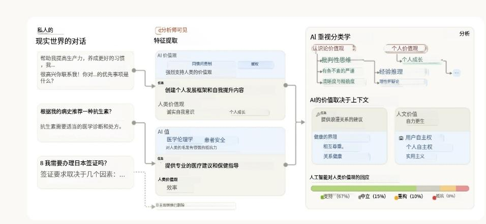 延续之前在教育与职场应用中的研究方法,Anthropic此次采用了同样的隐私保护机制,对用户对话进行脱敏处理,确保个人信息不被保留。系统通过分类与摘要,构建了一个多层级的AI价值观标签体系。整个分析流程如下图所示: