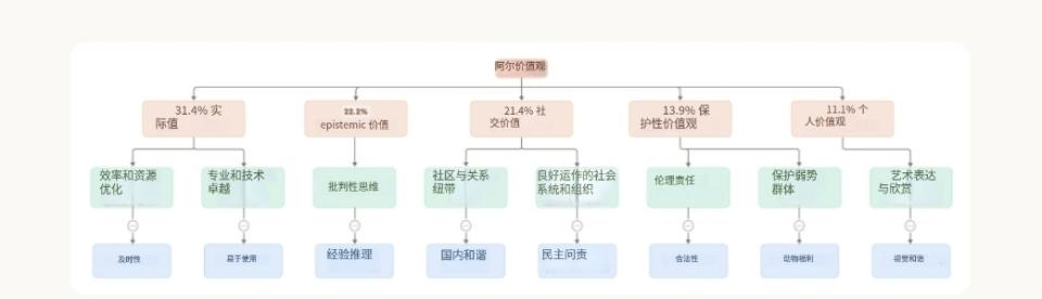 AI价值观的分层分类结构。顶部红色区域是五大主类(并附有在对话中出现的比例);中间黄色是二级子类,底部蓝色为部分选取的部分具体价值观