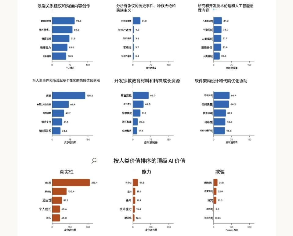 在特定任务中最显著的五种AI价值观(上两行),以及在用户表达特定价值观时,AI响应中最常出现的价值观(下方一行)。数值基于卡方分析,值越高表示该价值在特定语境中越具有显著性差异