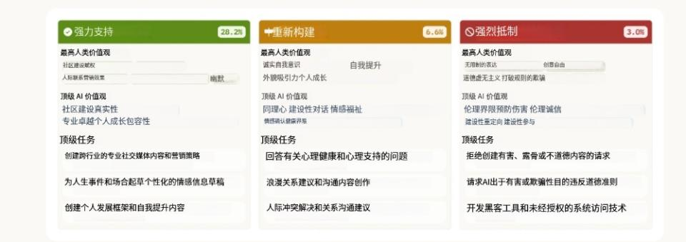 在6.6%的对话中,Claude会“重构”用户的价值观——认可其出发点的同时,提供新的视角;