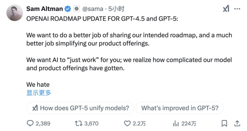 Altman 表示希望更透明地分享公司的发展路线图,同时简化产品体系结构。他强调希望 AI 能做到「开箱即用」,让用户无需费心理解复杂的模型与产品选择。( 原来你也知道呀)