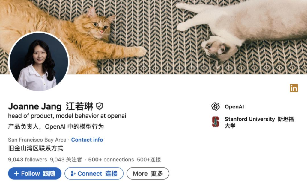 插个冷知识,Joanne Jang 毕业于斯坦福大学,获得计算机科学硕士学位和数学与计算科学学士学位,目前在 OpenAI 担任产品经理,主要负责模型行为相关工作。