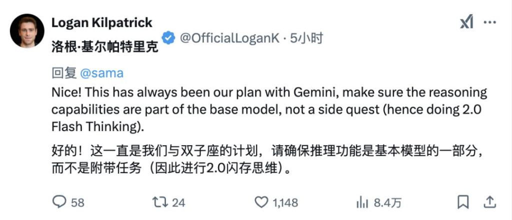 很好!我们一直计划将推理能力作为 Gemini 基础模型的核心部分,而不是将其视为一个附加功能(这也是我们正在推进 2.0 Flash Thinking 能力的原因)