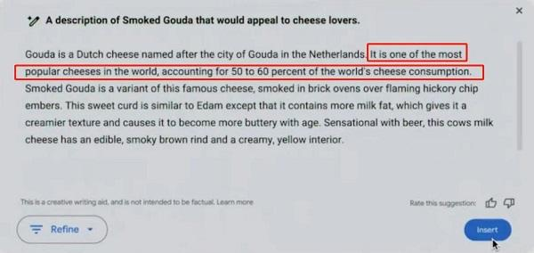 在全美盛事“超级碗”期间,谷歌本想通过50个州的50个小微企业案例,来展示Gemini AI 如何帮助商家经营增长,以赢得更多潜在客户对AI营销的兴趣和尝试。却未曾想到,其中一个奶酪商家用AI生成的产品描述“Gouda占据了全球50-60%的奶酪消费”(for 50 to 60 percent of the world’s consumption)引发大面积质疑。眼尖的奶酪爱好者指出这一数据明显与事实不符。