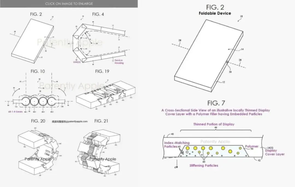 在另一份专利文件中,苹果描述了配合铰链实现无折痕的关键技术: