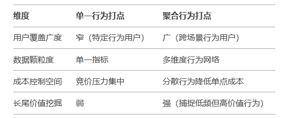在游戏广告中,通常会根据用户达到的等级(如等级10、等级20)进行打点,用户等级越高表示质量越好。而聚合打点的意思就是,除了等级之外,还考虑任务完成数、好友互动、每日登录等行为。将这些行为聚合起来形成一个综合打点,比如“活跃用户”,当用户完成任意一个指定行为(如完成任务或好友互动)即算达成目标。