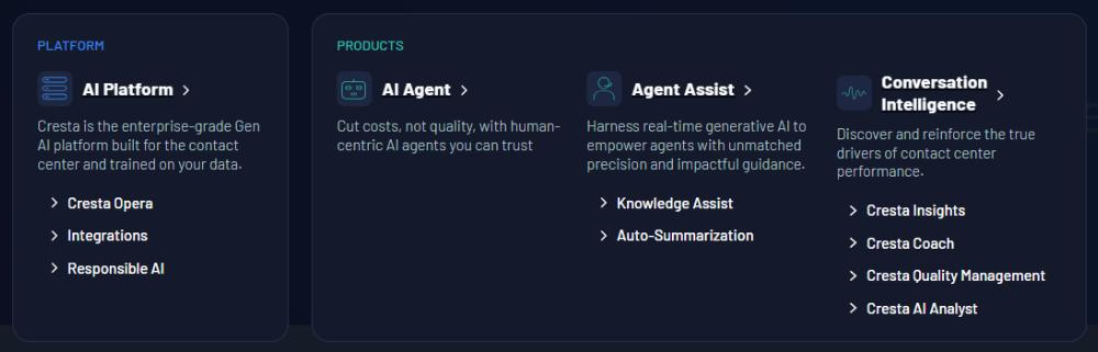 Cresta的主营业务是为联络中心提供一个端到端的生成式AI平台,该平台通过其核心产品Cresta AI Agent(AI 虚拟客服)、Agent Assist(实时客服辅助)、Conversation Intelligence (AI Analyst)(对话智能分析)以及AI驱动的质量管理和辅导等功能,提升客户互动体验,提高人工客服的工作效率和绩效,并最终帮助企业优化运营成本、增加收入并更深入地了解客户需求。