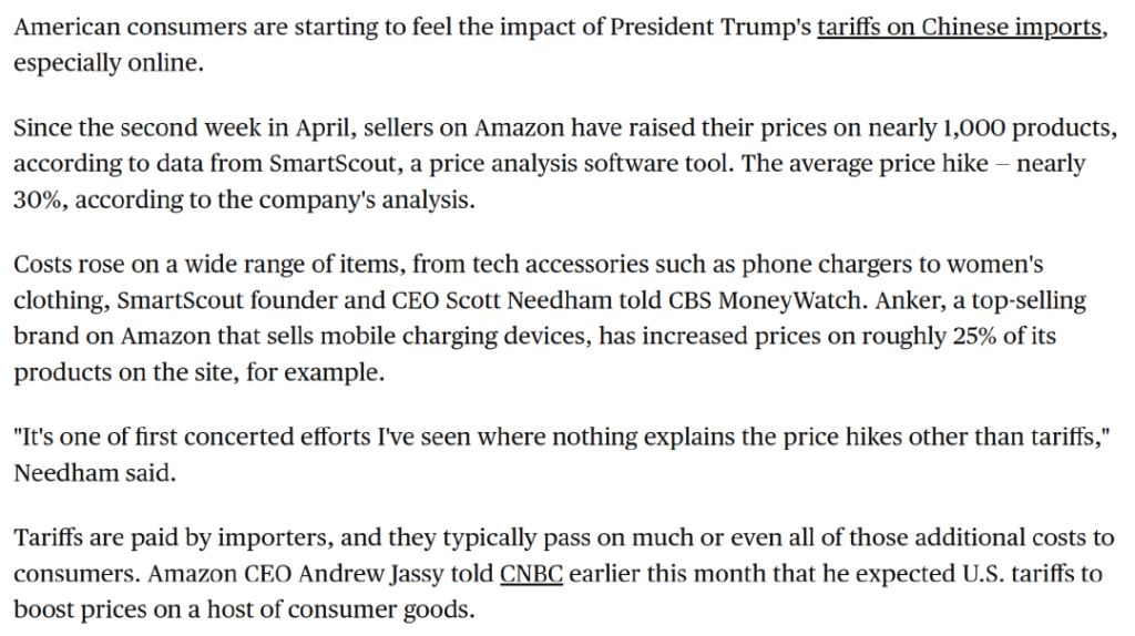 尽管亚马逊对此回应称这近1000种价格上调的产品仅占其网站排名前10万种产品的1%,并且还强调报告中平均30%的涨幅受“数量相对较少但涨幅较大的产品”影响较大,但在4月初,亚马逊CEO安迪·贾西便已承认,受关税影响,不少卖家可能会将成本“转嫁”给消费者。