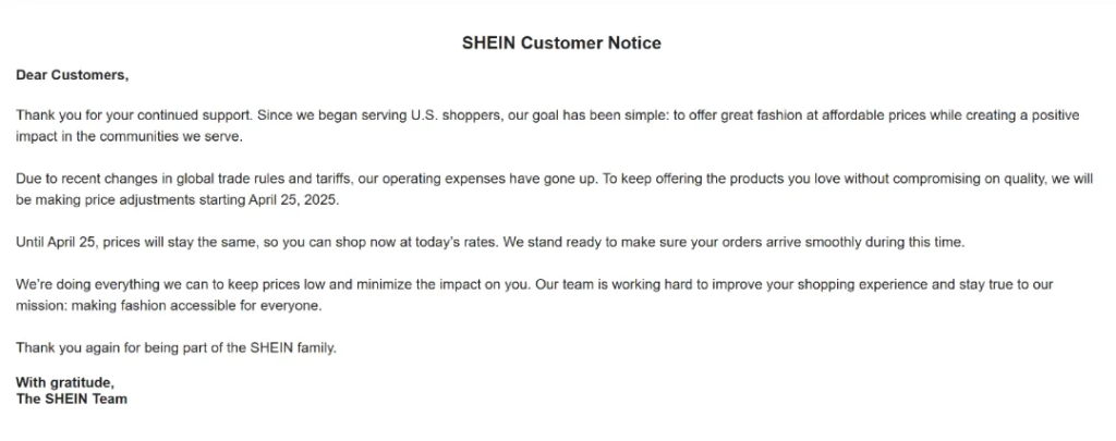 牛牛虚拟卡在此前的文章中提到,为应对关税调整下的运营成本上升,4月中旬,SHEIN和Temu曾向美国消费者发出一则“涨价预警”。而这项涨价计划已于4月25日正式生效。