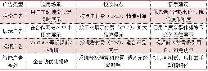 以下是Google Ads广告类型和适用场景,大家可以根据自己的需要选择适合的广告类型: