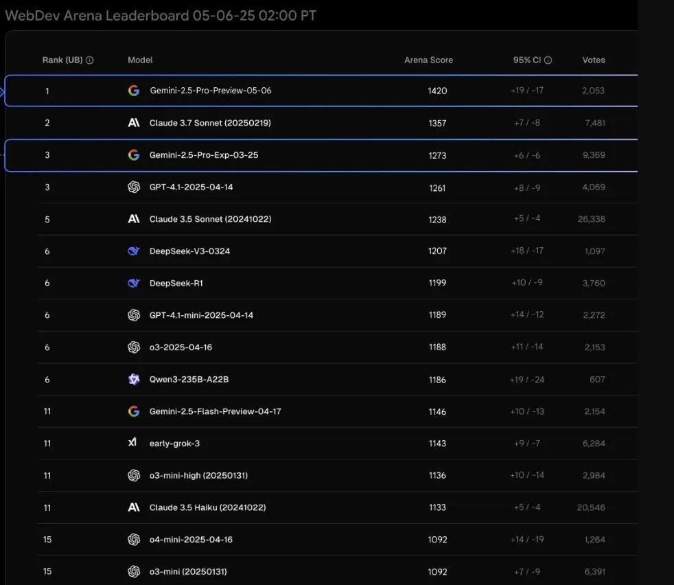 在第三方平台WebDev Arena的排行榜中,Gemini 2.5 Pro Preview(05-06)在生成美观且实用的网页应用方面获得了人类评审的最高分,超越Anthropic的Claude 3.7 Sonnet,登顶榜首。