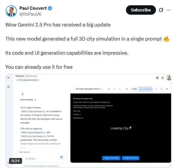 多个知名开发者与平台负责人已对Gemini 2.5 Pro Preview(05-06在实际生产环境中的表现给予高度评价。