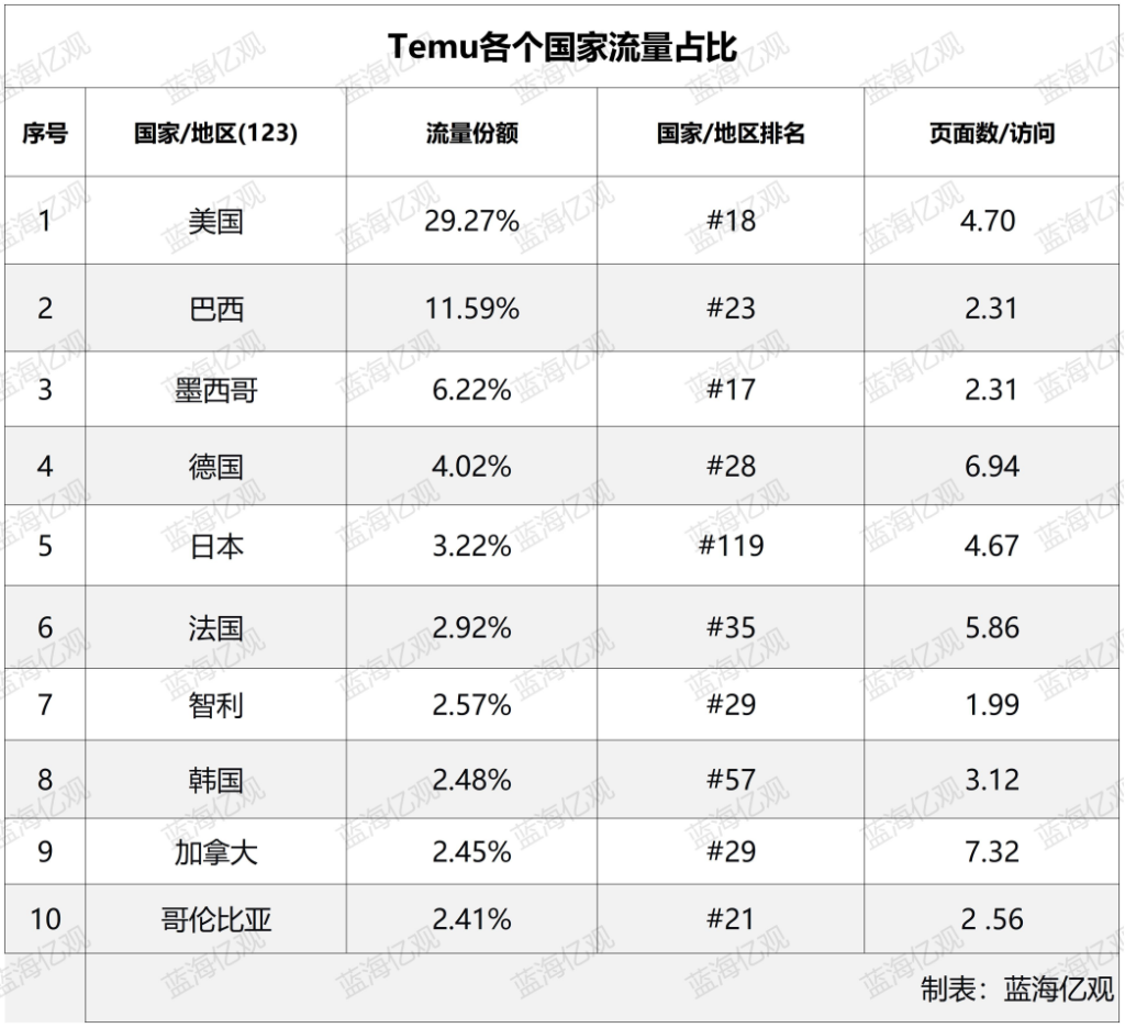 美国是Temu的发家之地,也是其最重要的市场。目前,美国给Temu贡献的流量比例高达29.27%,相比之下,其他国家(除了巴西)给Temu贡献流量占比仅为个位数。