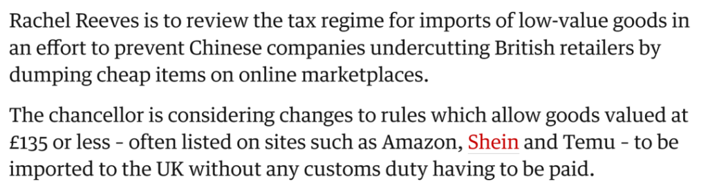 4月23日英国卫报报道称,英国财政大臣Rachel Reeves宣布将对低价值商品进口税收制度展开审查,按照英国现行制度,货值低于135英镑进口商品可免税进入英国,但该项制度被亚马逊、TEMU、SHEIN等在线平台“滥用”,构成倾销嫌疑,这一说辞,不仅与美国取消小包豁免颇为一致,甚至连被点名的中国平台都如出一辙。