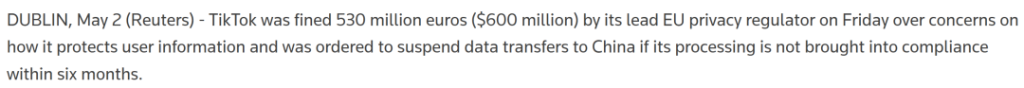 当地时间5月2日,爱尔兰数据保护委员会(DPC)宣布对TikTok处以总计5.3亿欧元(约合人民币44亿元)的行政罚款。DPC责令TikTok在六个月内使其数据处理活动符合法规要求,如果TikTok未在规定期限内整改到位,其向中国的数据传输将被暂停。