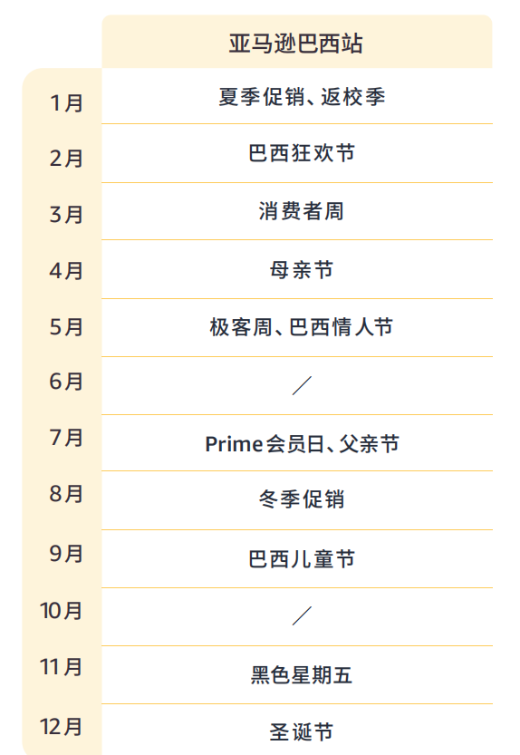 除了巴西本身的节日带动消费氛围外,各线上线下的销售渠道也会创造各种促销契机,让巴西消费者充分享受节日和狂欢的氛围。以亚马逊巴西站为例,全年有 13个促销节点,为卖家提供了无限商机。
