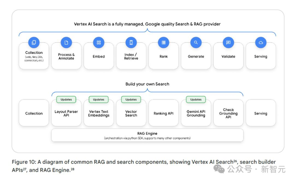 Vertex AI Search拥有布局解析器、向量排序API等组件,还提供RAG引擎,通过Python SDK进行编排,支持众多其他组件。