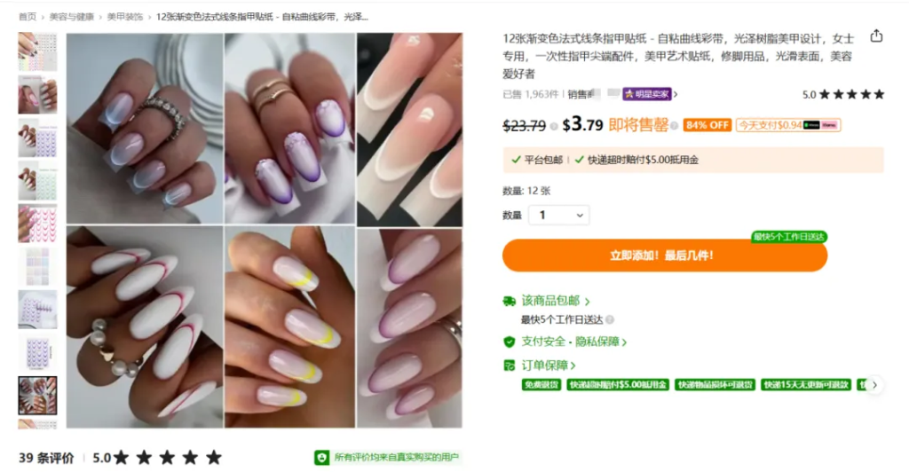 雨果跨境在第一时间对Temu官网进行了仔细查看,发现一些蛛丝马迹:在美甲类目的商家中已有来自深圳、佛山、广州的公司,这些产品并没有标注“本地仓库”及“无进口费用”的标志,疑似全托管恢复的第一批卖家。