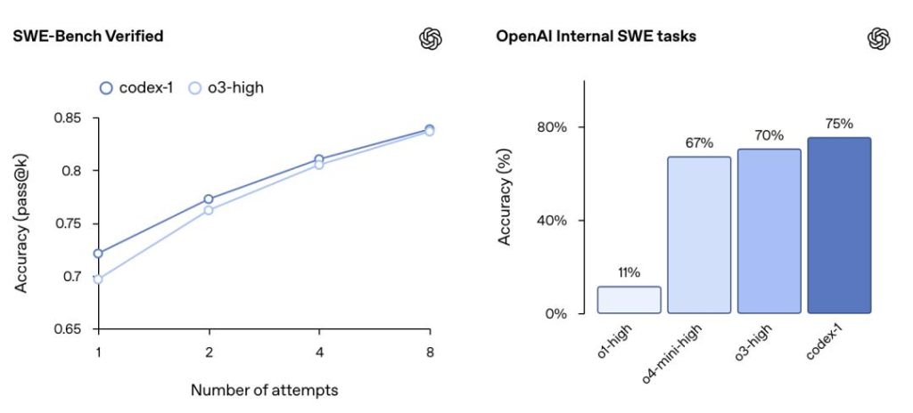 在编码评估和内部基准测试中,即使没有AGENTS.md文件或自定义代码生成器,codex-1也表现出强劲的性能。