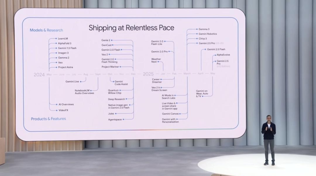 Gemini时代,谷歌的模型和产品发布速度都比以往更快。上届I/O大会至今,谷歌已经宣布10余款模型重大突破、20余款重大AI产品。
