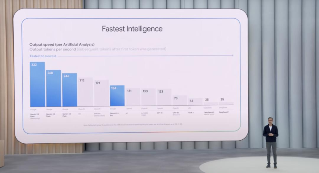 在LMArena排行榜中,Gemini系列模型包揽了每秒生成输出token数最高的前三名,并且模型价格也在下降。