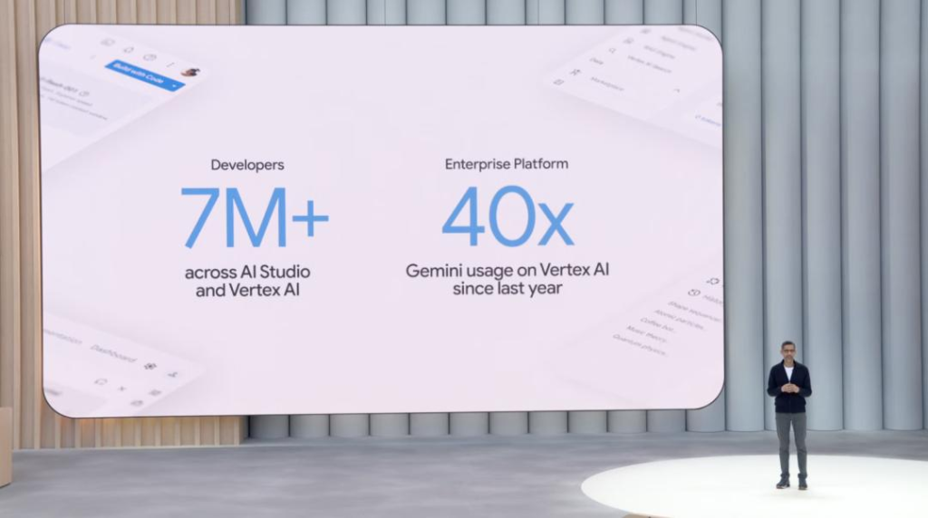 超过700万名开发者通过Gemini API进行开发,涵盖谷歌AI Studio和Vertex AI两大平台,同比增长超过五倍,同时Vertex AI平台上的Gemini使用率较去年增长40倍;