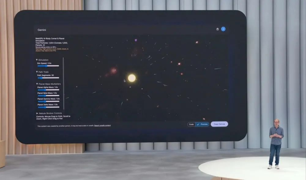 谷歌Gemini产品负责人Tulsee Doshi展示了Gemini 2.5 Pro的编程能力。现场,Gemini 2.5 Pro仅参照一张草图就生成了完整的3D交互网页,用时37秒就在原网页代码上完成修改。