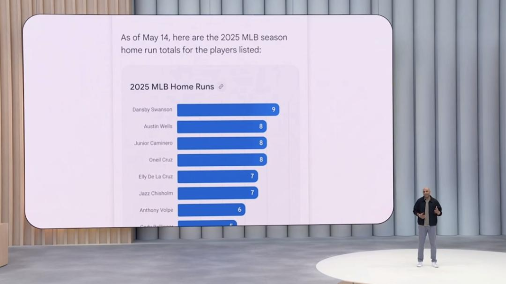 AI Mode在体育数据、金融分析中的深度应用会于今年夏天推出。如让其展示本赛季和上赛季使用鱼类球棒球员的打击率和上垒率,这个问题包含不同赛季、使用特定球棒的球员、打击率、上垒率等多个要素。其会动态为用户生成如图表等适应用户观看的界面。