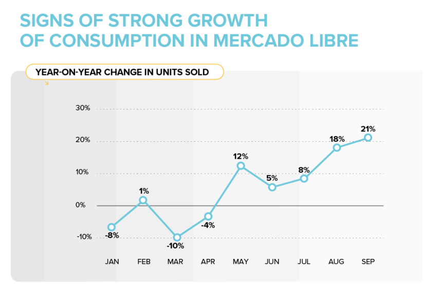 根据Mercado Pago的数据指出,免息分期付款融资、折扣和促销对实体店产生了积极影响,9月份其二维码交易量同比增长68%。