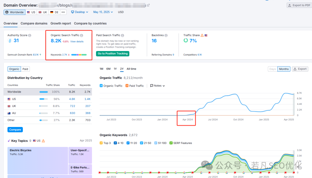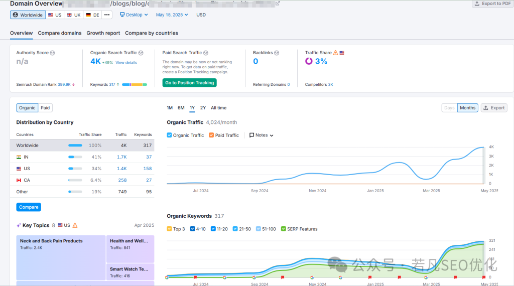 我们喜欢使用semrush追踪,这是我们的项目24年写的一篇文字,目前每个月估计可以给他带来4K的流量。