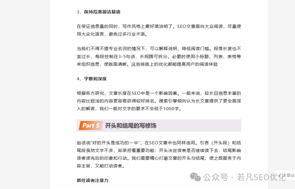 对于文字长度,若凡和其他人的见解不同,我认为文章长度在SEO中还是一个影响因素。一般来说,较长且信息丰富的内容比短浅的内容更容易获得较好排名。