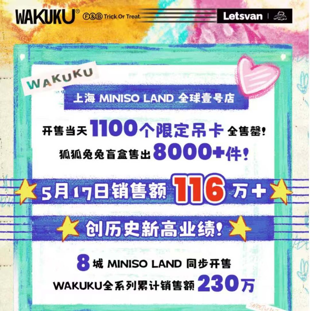 最近,宣称对标泡泡玛特的潮玩IP wakuku也开始发力,据TK观察了解,上市公司量子之歌刚刚完成了对wakuku的收购,现在和零售连锁巨头MINISO也达成了战略合作,5月17日,WAKUKU狐狐兔兔新品在上海线下首发,当天单日销售额达116万,创造历史新高,盲盒跟吊卡一起售出9100多件!潮玩经济的火爆,可见一斑!