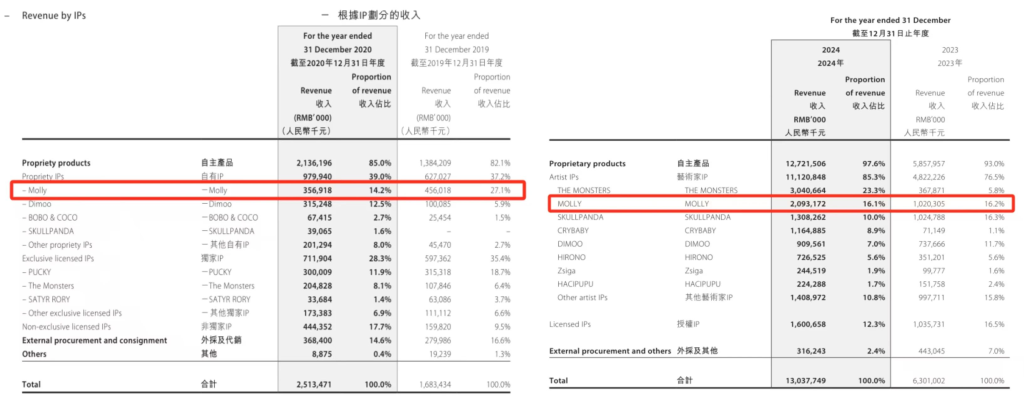 但潮玩IP不是生活必需品,它对于人们来说有很强的替代性,单一的潮玩IP最终会走向末路,因此泡泡玛特为体谅Molly“一人养活全家”的辛苦,选择创造更多的孩子一起分担“养家”的辛苦。据悉泡泡玛特基本上保持周更节奏,每周上新2至3款新品。且据泡泡玛特财报显示,以IP划分收入,Molly在泡泡玛特中收入占比由过去的TOP1缓缓降至2024年的TOP2,登上TOP1的是THE MONSTERS。再加上火出海外的Labubu、SKULLPANDA、DIMOO……或许有一天,Molly可能会退居幕后看着这些新生IP在世界舞台绽放。