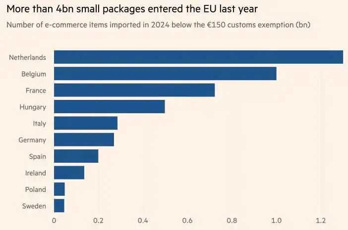 此前,欧盟对价值低于150欧元(约合人民币1225.1元)的进口小额包裹实行免税和较宽松的监管政策。数据显示,2024年总计约46亿件小额包裹通过这一政策进入欧盟市场,其中91%来自中国,并且数量预计将持续增长。