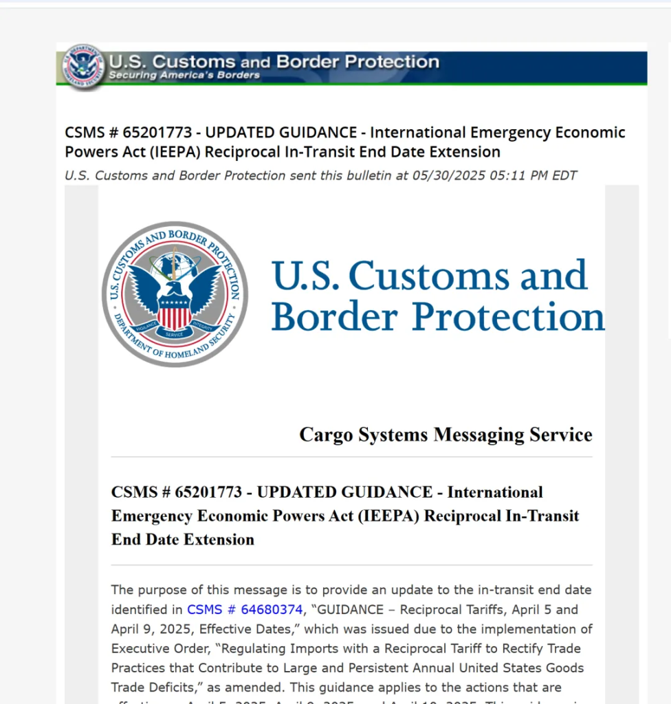 在途豁免截止日期延长:原定5月28日的“在途货物关税豁免”政策截止日期被延长至2025年6月16日。这意味着那些在2025年4月5日、9日或10日之前已装船并在运输途中,且在6月16日之前完成入境申报的货物,依然能够享受关税豁免(注意:豁免的为IEEPA项下的互惠关税)。