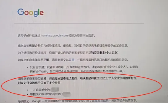 谷歌在验证开发者身份时,如果判定开发者资料不合格,除了后台直接驳回请求外。还会给开发者的邮箱发送一份邮件,邮件内容里面会详细的说明验证失败的具体原因,开发者要做的就是针对邮件里面提到的具体内容进行针对性的调整,调整无误后再重新进行验证。