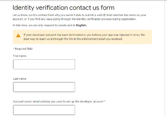 这里申诉的对象主要就是针对身份验证失败的开发者,填写对应表单内容。向谷歌阐述无法验证通过的理由(注意,这里有提到申诉的内容只能使用英语填写)。当我们填写完成表单后就只能等待谷歌方面的反馈了,幸运的话是可以通过这种方式验证成功的。