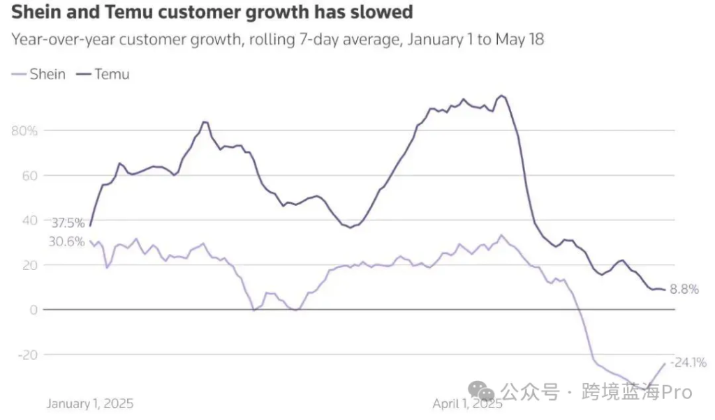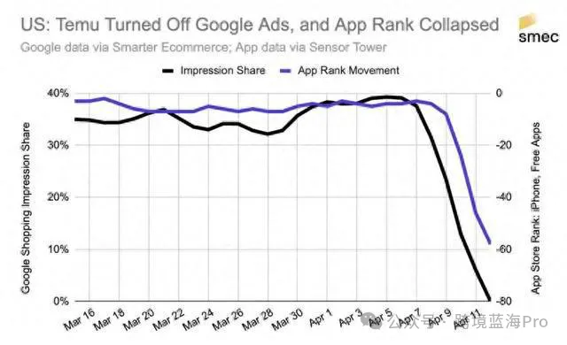 对于一个靠“低价+广告”模式打天下的平台而言,失去低价优势,意味着增长引擎熄火。再加上其在谷歌、Facebook、YouTube等平台大幅削减广告投放,仅在4月初至中旬的两周内,Temu的整体广告支出就减少了31%。