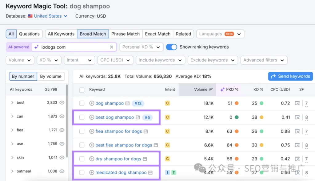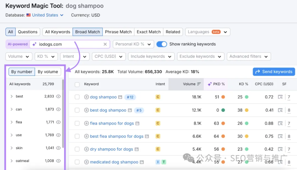方法二:用 Semrush 的 Keyword Magic Tool,这个工具的挖词能力非常强。