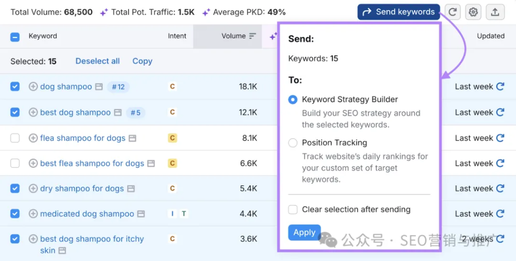 在找到相关关键词后,勾选其旁的复选框,然后点击「发送关键词」按钮,将它们添加到 Keyword Strategy Builder(关键词策略构建器)中。